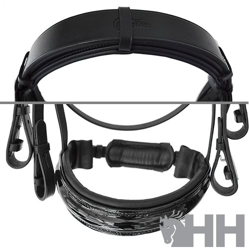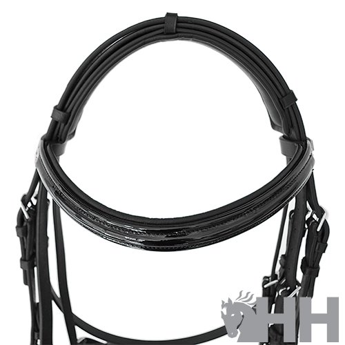 Cabezada para filete y bocado realizada con cuero de primera calidad y hebillaje de acero inoxidable. Frontalera y muserola realizada en cuero charol. Muserola acolchada extra ancha (5 cm de anchura en la parte interior) y testera acolchada. Cierre de la muserola de dos piezas con acolchado y correa para tensar.